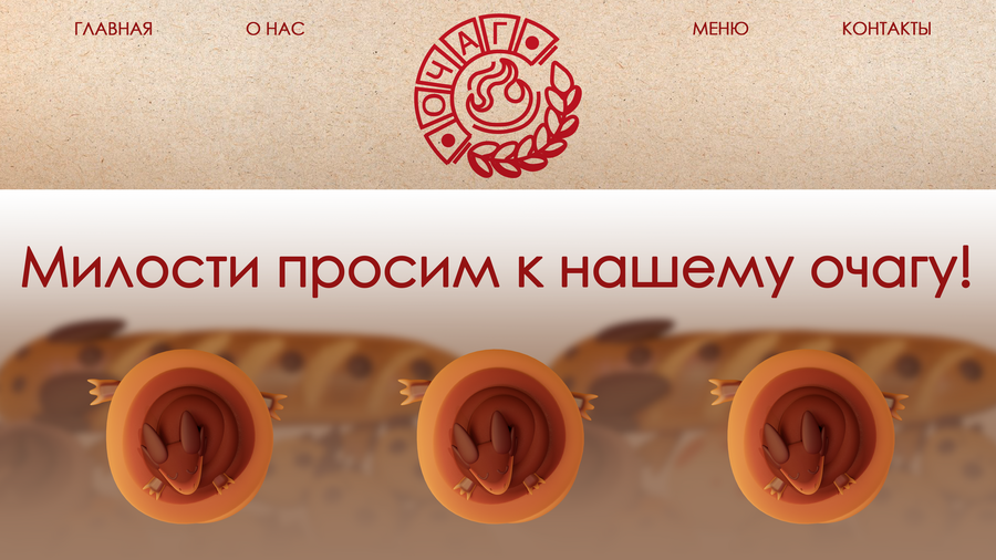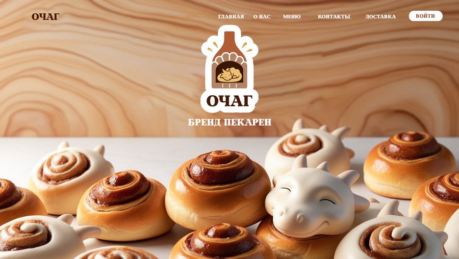 Промт сайта: A warm and inviting website interface for the «Очаг» brand bakeries, with a dominant color scheme of golden brown, creamy whites, and soft pastels, evoking a sense of comfort and sweetness. The logo, «Очаг», is prominently displayed in a modern, cursive script with rounded edges, in a rich, burnt orange color. The main attraction is a scattering of adorable, sleeping dragons, each shaped like intricately swirled cinnamon buns, with delicate, shiny scales in hues of caramel and honey. The dragons' eyes are closed, with tiny, contented smiles on their snouts, as if dreaming of sweet treats. The website’s background is a subtle, textured wood grain, adding warmth and coziness to the overall design. The layout is clean and modern, with ample whitespace, making the precious dragon-buns the clear focal point, enticing visitors to explore the world of «Очаг» bakeries.