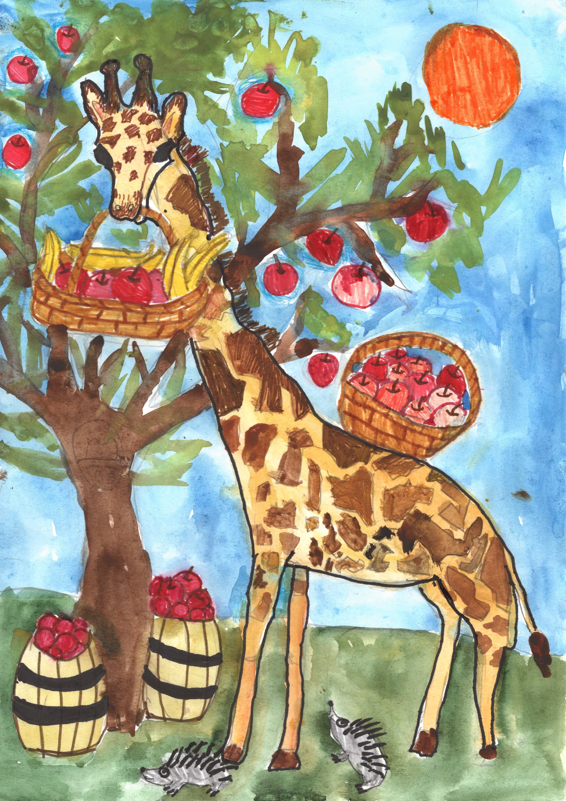 Супер-жираф помогает ежам собирать самые вкусные яблоки. Благодаря своему росту, он может доставать плоды с самых высоких веток. Помощь и поддержка важны для всех!