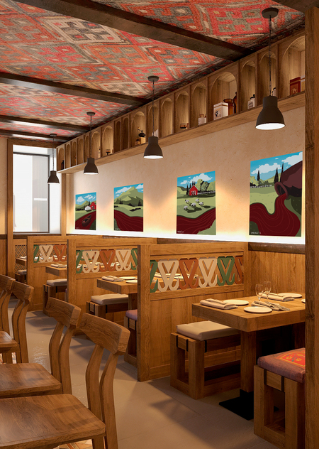 Сюжет постеров отсылает посетителя ресторана к грузинскому виноделию. Винная река, берущая начало в квеври, преодолевает главные винодельческие регионы страны, минуя характерные черты грузинского мира: храмы, горы, кипарисы, стадо баранов. Сядем же в лодку, чтобы отправиться в путешествие по культуре Грузии вместе с Пхали-Хинкали!