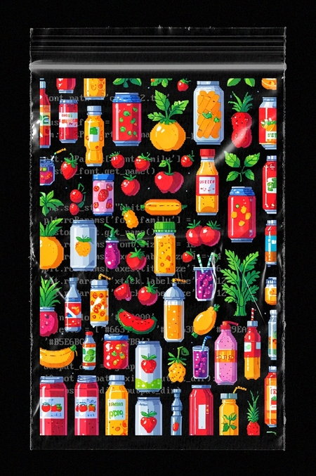 «Pixel art, transparent background, vibrant colors, 16-bit style, food and drink items (like fruits, vegetables, soda cans, and juice bottles) arranged in a playful pattern, retro gaming aesthetic, clean lines, no shading, flat design, high contrast, centered composition, suitable for use in a project about student food habits»
