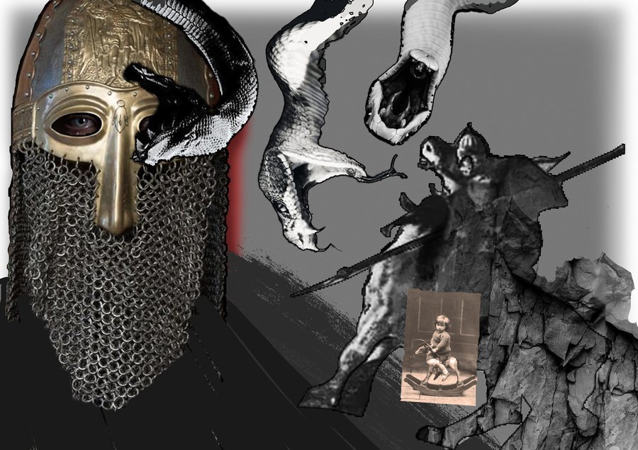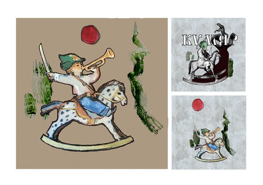Верхний ряд: Кибрик Е.А., иллюстрация к былине «Добрыня и змей». Нижний ряд: деревянная лошадь-каталка; Тризна Ю.С., иллюстрация к книге «Чего у Вани нет в кармане»; архивное фото с ребенком