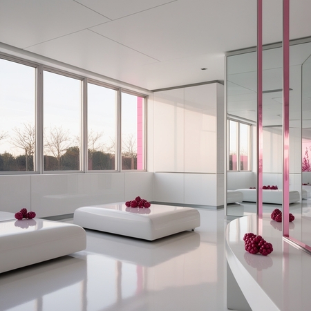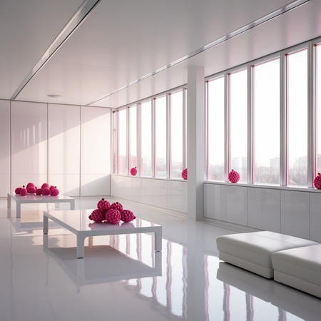 /prompt: A minimalist, gleaming white office relaxation room with a limited number of accent pink elements in the form of berry-shaped decorations, room complemented by large windows.