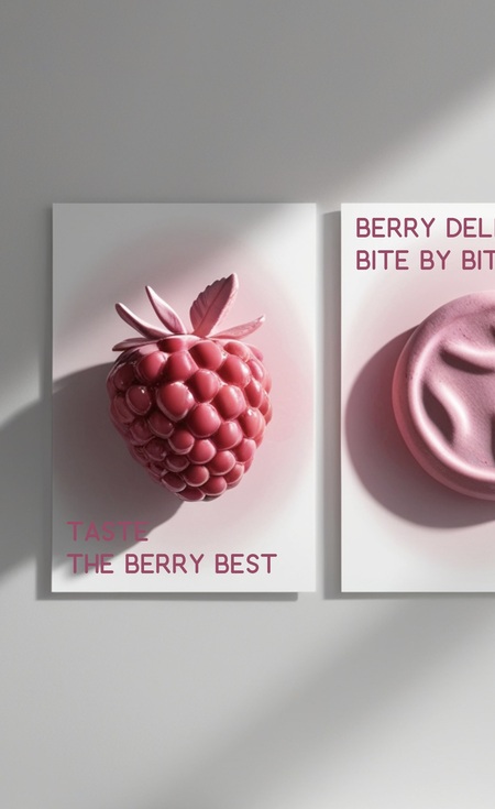 /prompt: Three posters on a white wall, each featuring a minimalist depiction of a raspberry and a cookie sculpted from vibrant pink glossy gypsum on a white background with pink gradient.