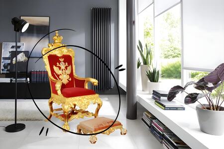 Насколько первое кресло хорошо вписывается в окружающую среду, и насколько неудобным в домашней обстановке выглядит королевский трон с его величественными формами и роскошными отделками, он выглядит неуместно в домашней обстановке.