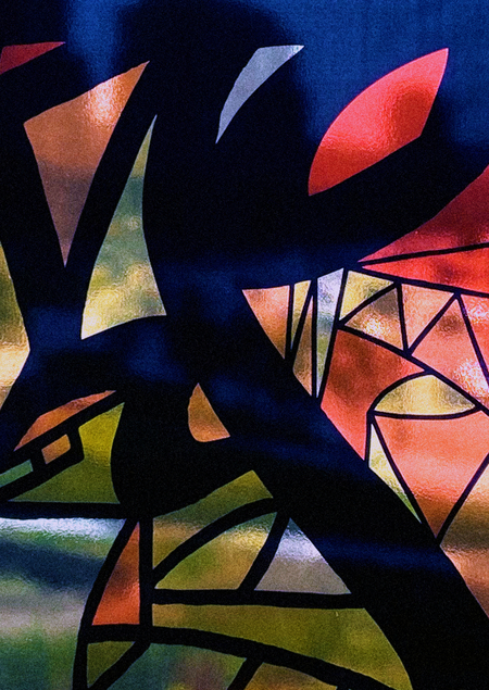 Витраж, состоящий из трех частей, создан на основе картины Уильяма Блейка и Откровения апостола Иоанна Богослова (Апокалипсис). Композиция для витража создана из букв авторской вариации островного полуунциала.