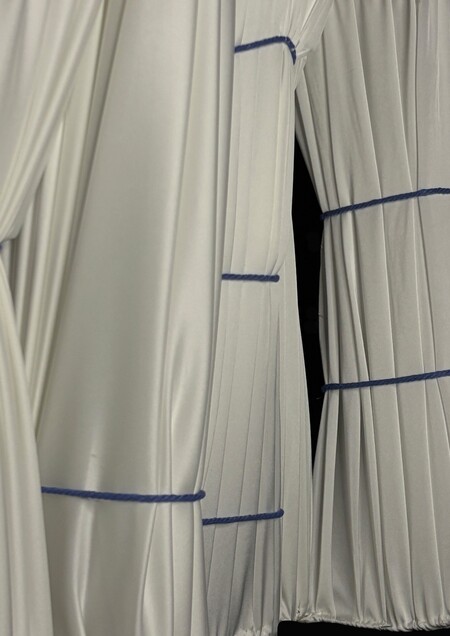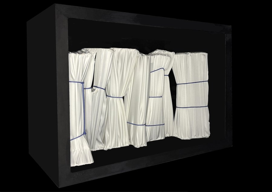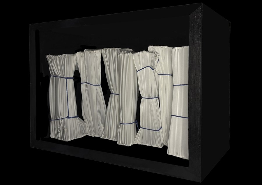 Витрина представляет собой обернутое имя художника. Нечеткие контуры создают ощущение движения, приглашая зрителей к размышлениям о том, что истинное значение и функция могут быть скрыты под поверхностью.