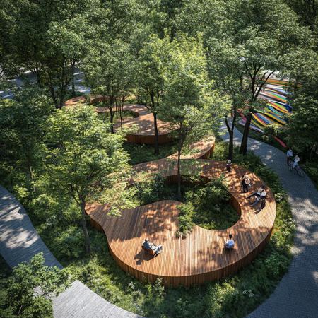 Промпт для генерации реалистичного изображения в нейросети — An urban park setting viewed from above, emphasizing a circular wooden platform designed to blend with the natural environment. The platform consists of interlocking circles of varying sizes, raised slightly above the ground and incorporating trees that grow through openings, creating a harmonious fusion of natural and human-made elements. People are engaging in casual activities: a couple is conversing on one section of the platform, while another individual is seated, enjoying the serene environment. A winding paved pathway cuts through the park, leading toward vibrant, colorful striped ribbons suspended diagonally in the background, adding a playful and dynamic element to the scene.