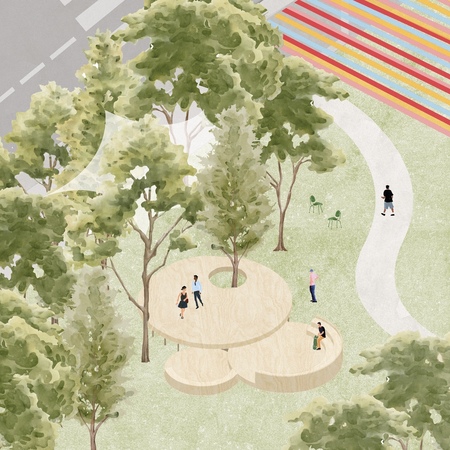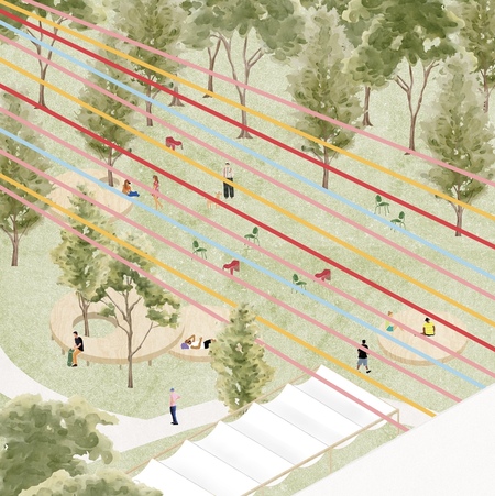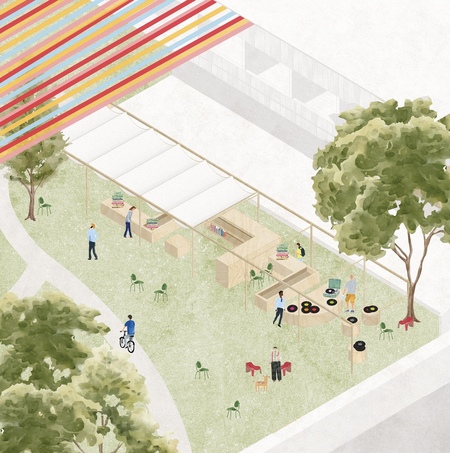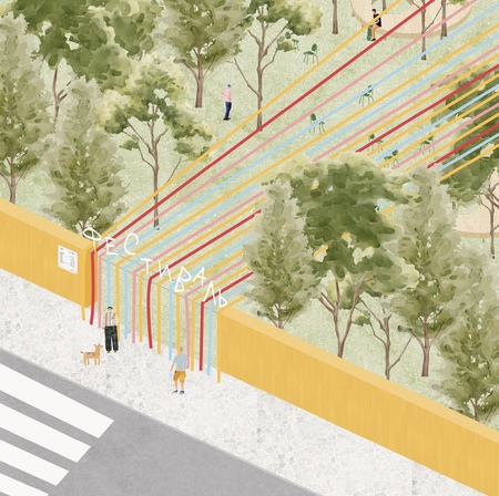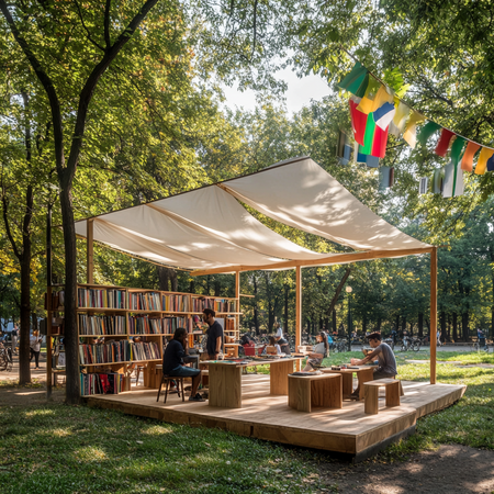 Промпт для генерации изображения создан на основе исходного изображения авторского проекта — A serene park setting showcasing a small communal area with a light, airy feel. The space features a rectangular canopy structure made of wood, covered with white fabric for shade. Under the canopy, there are wooden tables, shelves filled with books, and a few records on display. Nearby, individuals are engaging in various activities: one person is browsing books, another is interacting near a record player, and others are leisurely walking or cycling along the curved pathways. Scattered chairs and stools are arranged casually around the area, inviting people to sit and relax. The surroundings are lush with trees and green grass, adding a peaceful, natural ambiance. Above the scene, colorful striped ribbons are suspended diagonally, introducing a playful and festive touch.