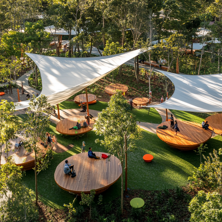 Промпт для генерации реалистичного изображения в нейросети — An open park area viewed from above, featuring an interplay of natural elements and artistic design. The foreground includes a white canopy made of stretched fabric supported by a wooden frame, providing shade for visitors. Behind the canopy, the park unfolds with circular wooden platforms raised slightly above the grass. These platforms are built around trees, integrating natural elements into their design. People of all ages are scattered across the scene, engaging in leisurely activities: sitting, talking, reading, or simply enjoying the environment. These ribbons add a sense of movement and festivity, contrasting with the serene greenery of the park. Small, scattered chairs and stools, both red and green, dot the grass, inviting visitors to sit and relax. The area is surrounded by tall trees that provide shade and a sense of calm.