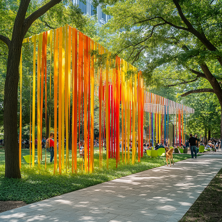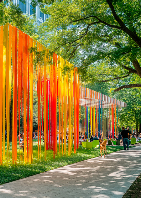 Промпт для генерации реалистичного изображения в нейросети — Cheerful outdoor festival set in a park. The scene features a bright yellow fence along the bottom edge, with colorful ribbons in red, orange, and blue extending diagonally upward into the park, creating a vibrant and dynamic entrance. Inside the park, a lush landscape of trees with varying shades of green fills the area, creating a natural and relaxing atmosphere. The ground is covered with soft green grass, and scattered throughout are simple green chairs and tables. Several people are casually enjoying the spacesome walking, others sitting under the trees. A man is seen walking his dog near the park entrance, and another person stands nearby, gazing at the vibrant display.