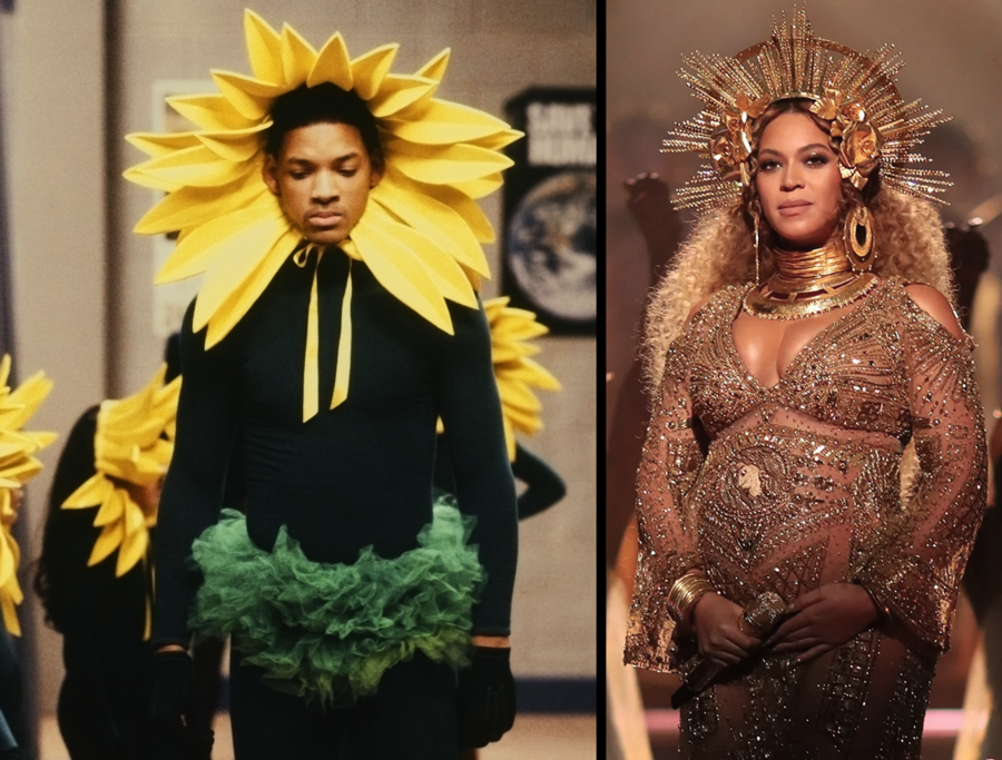 Представители западного общества // Уилл Смит в костюме подсолнуха. Кадр из сериала «Принц из Беверли-Хиллз» (1990–1996 гг.) // Бейонсе в образе Peter Dundas на Grammy Awards, 2017 г.