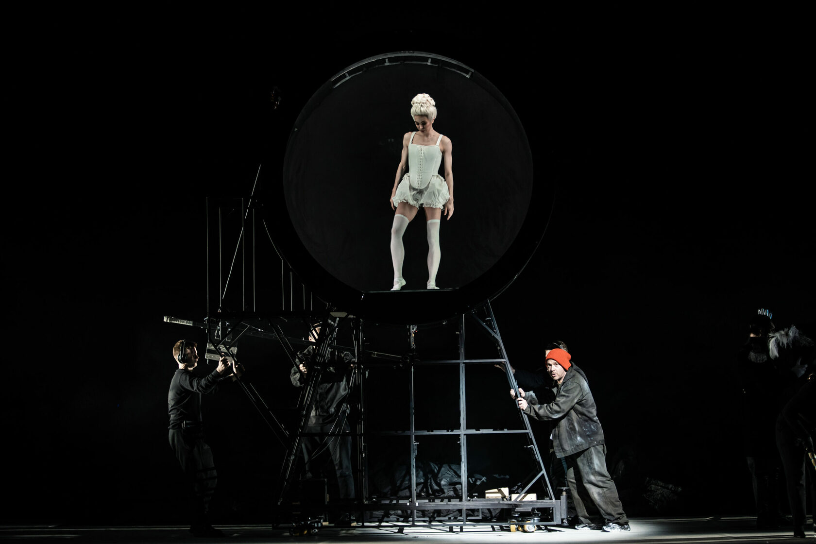 Преображение Левши-героя Лескова в работника театра происходит с помощью головного убора: парик сменяет шапку и на сцене уже другой человек. Вместе с тем действие переносится в современность. По ходу действия к нему присоединяются другие участники закулисья, что-то двигая и настраивая. Левша шутит и рассказывает о работе в театре.