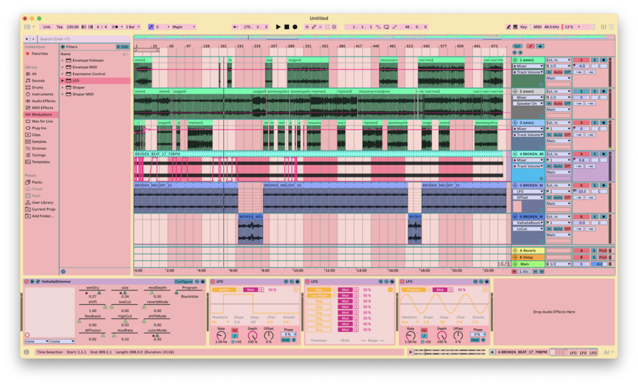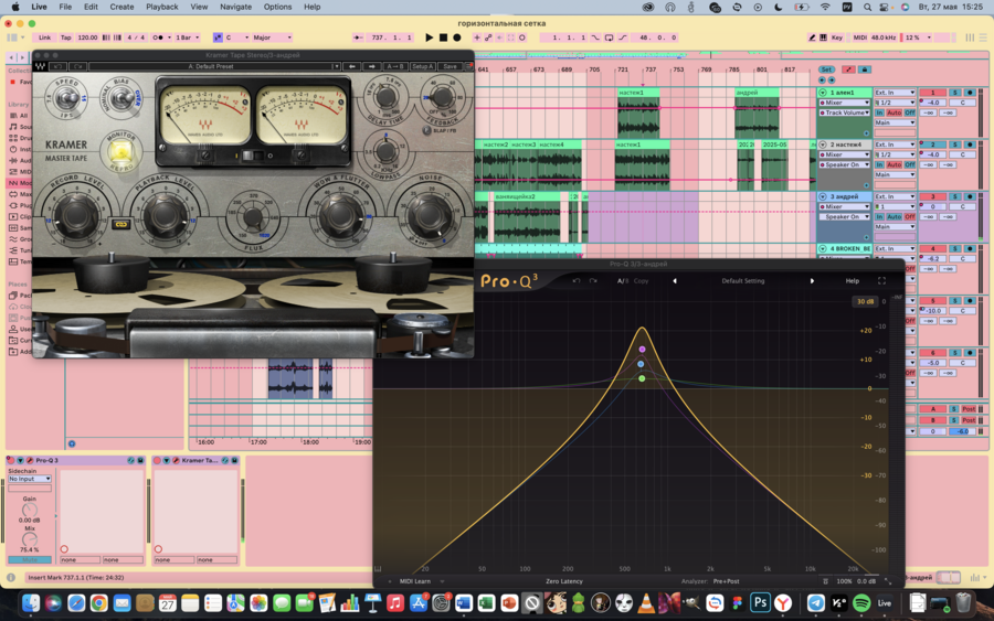 Обработка звука довольно масштабная и опять же использована эквализация + компрессия и немного реверберации.