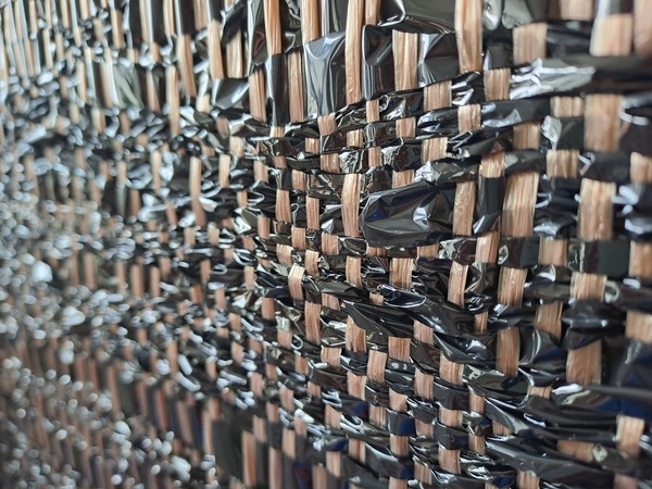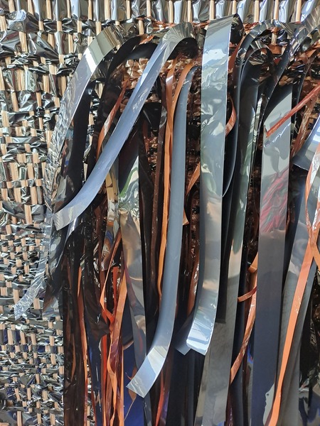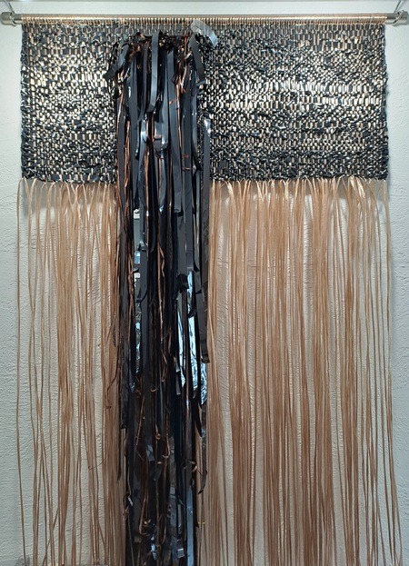 Гобелен «Звук водопада», аудио и видео плёнка, рафия, ручное ткачество, 100×80см, 2024 г