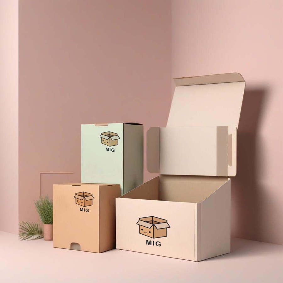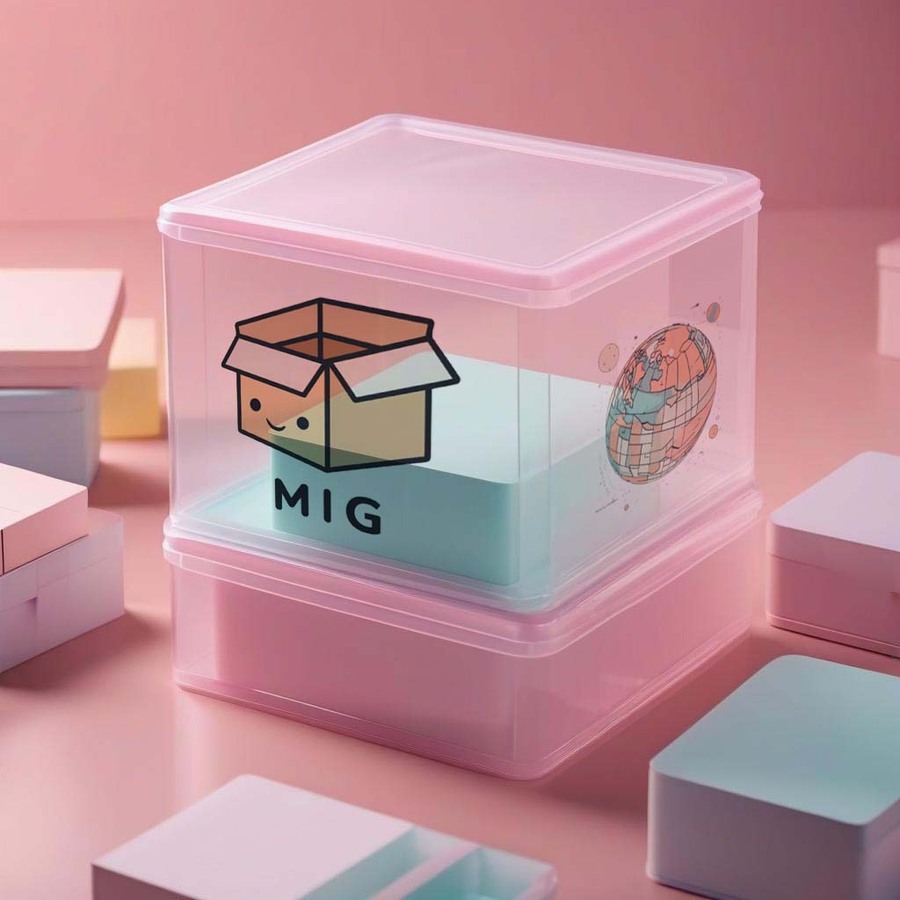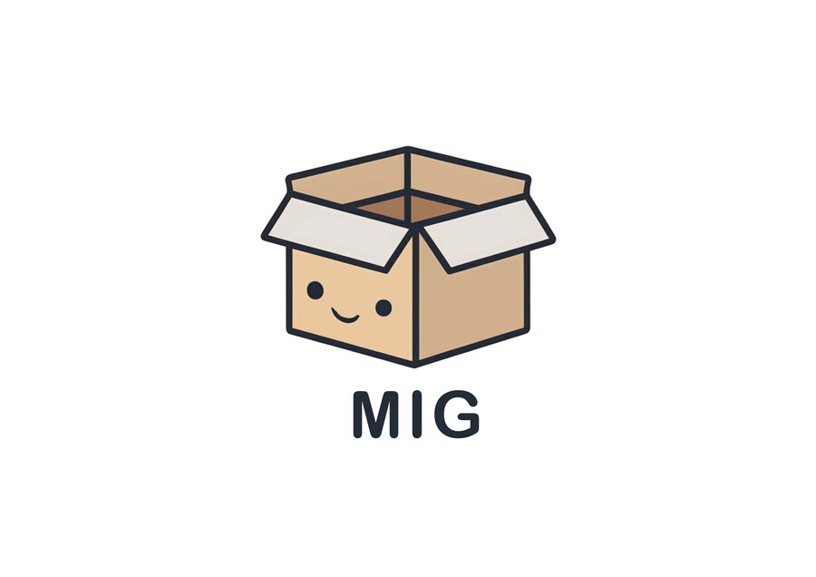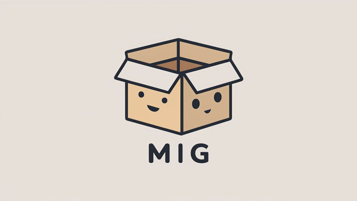 prompt: simple vector minimalistic style logo for company named MIG, a cardboard box with face, monochrome background, soft edges, anime style, pastel colors