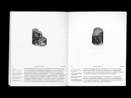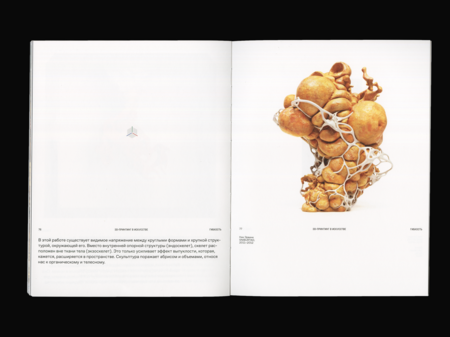 На разворотах появляются изображения-иконки, на которых наложен эффект тиснения. Таким образом они стилистически перекликаются с 3D-печатными работами