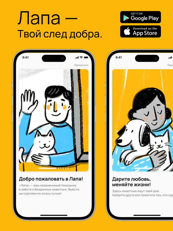 «Лапа» — подари шанс на жизнь бездомным животным. Найди себе друга, окажи помощь приюту, стань виртуальным опекуном — всё это легко и удобно с нашим приложением. Поможем им вместе!