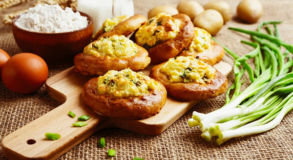 Перепечи с картофелем, рыжиками и красной икрой / Посикунчики с говядиной и капустой под соусом из копчёной сметаны