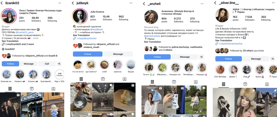Для продвижения ужина были отобраны 8 блогеров — каждый со своей аудиторией и стилем. Среди них — те, кто рассказывает о культурной жизни Перми, гастрономии и локальных пространствах.