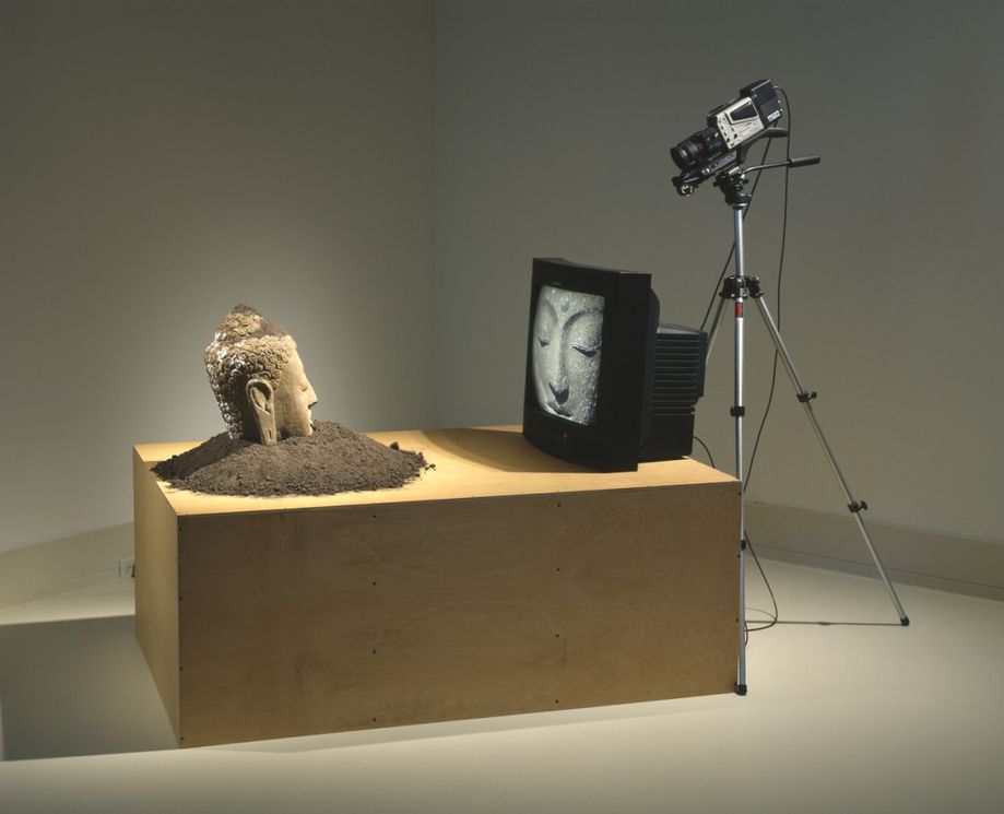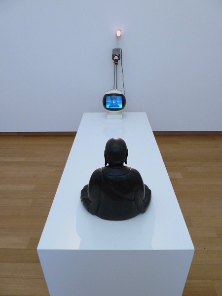 Работа впервые была представлена в 1974 году и представляет собой скульптурную инсталляцию, в которой статуя Будды сидит перед телевизором, на экране которого отображается его собственное изображение-отражение, переданное с камеры, направленной на него.
