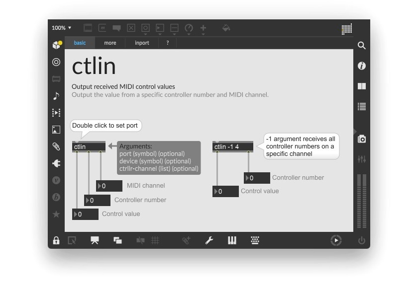 ctlin (Control Input): объект предназначен для приема MIDI-контрольных сообщений. Эти сообщения могут содержать информацию о движениях регуляторов (например, поворот колеса).