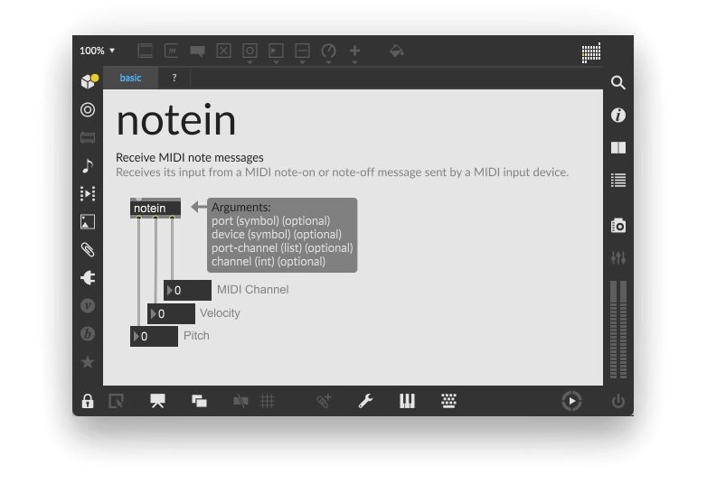 notein (Note Input): используется для приема MIDI-нотных сообщений. Содержит информацию о нажатых клавишах, их высоте, громкости и других параметрах.