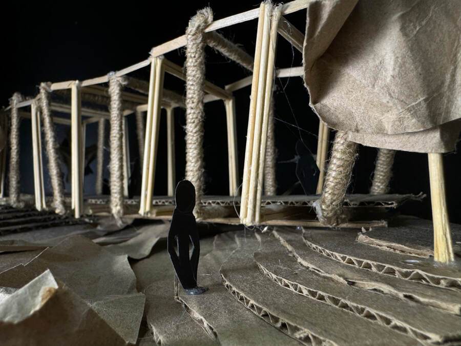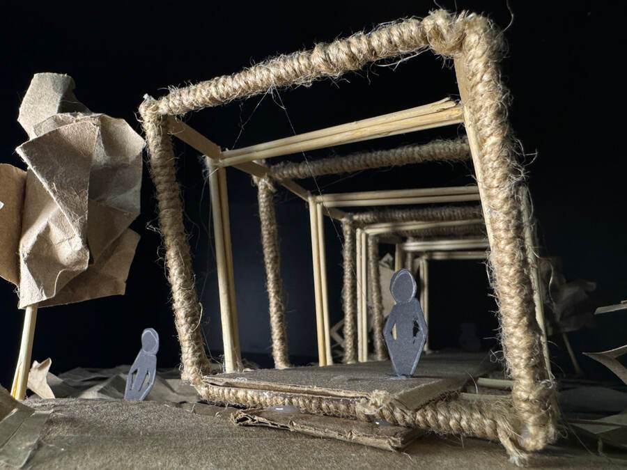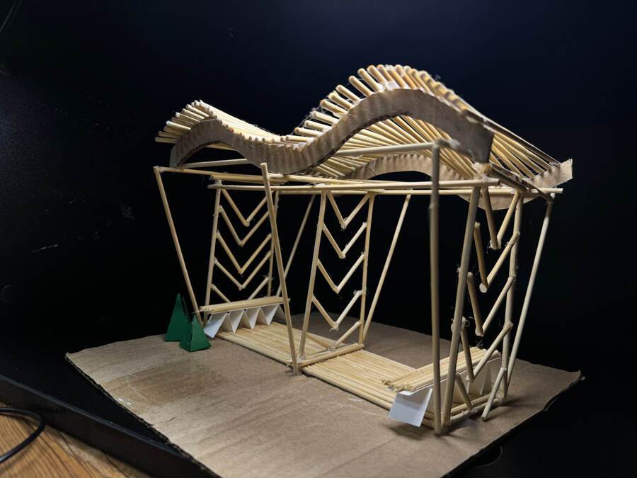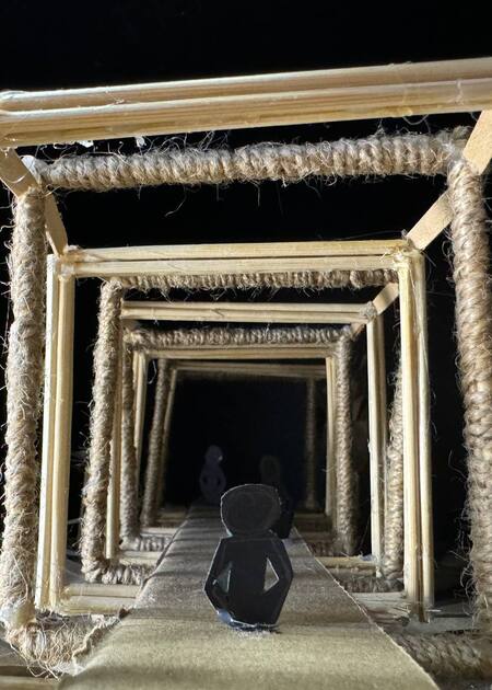 Разработана ЭКОТРОПА через лесную реку. На макете представлен пешеходный мост, подходящий для преодолевания реки, активного отдыха и прогулок. Проект состоит из экологически чистых материалов, не выделяющих в атмосферу вредных веществ, безопасных для здоровья людей. Мост представляет собой тропинку для передвижения людей. Над самой пешеходной дорожкой на частом расстоянии друг от друга расположены декоративные конструкции квадратной формы, оформленные из двух материалов. Частые метричные элементы вызывают иллюзию погружения. Погружения в мир дикой природы. Мост гармонирует с натуральным природным ландшафтом и подходит под общий рельеф природной местности. Предложен дизайн ЭКОбеседки, находящейся неподалеку от реки.