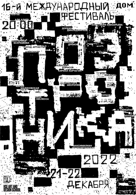 Плакаты для ежегодного международного фестиваля современной поэзии «Поэтроника», проходящего в этом году Культурном центре «Дом». В процессе работы был разработан собственный акцидентный шрифт, созданный вручную с помощью высохшего маркера. В основу стилистики легло произведение искусства — «Черный квадрат» Малевича. Второй плакат сделан малярным скотчем на черной бумаге.