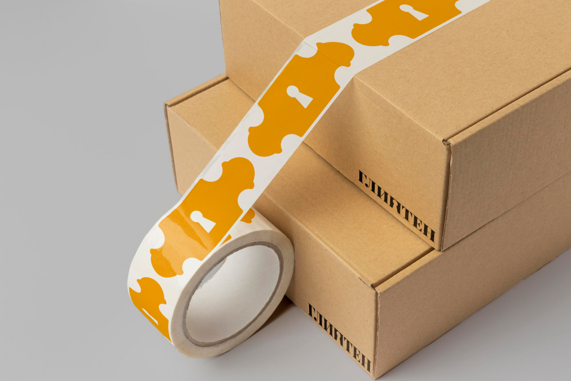 Packaging tape with a bold and minimalist design featuring a seamless pattern of keyhole shapes in yellow on a black background. The tape design reflects security and sophistication with clean, sharp lines and a modern aesthetic. --ar 16:9 --v 6.1