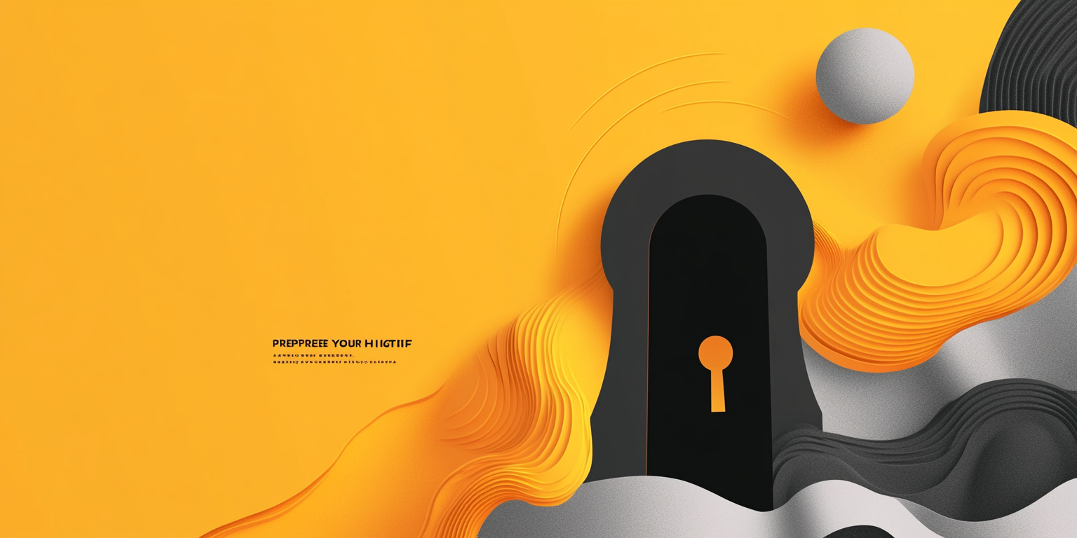 Large promotional banner design featuring an oversized black keyhole on a bright yellow background. The composition includes flowing abstract shapes in orange and gray to create a sense of movement and depth. The text 'Preserve Your History' is displayed in bold, modern typography, with additional details in smaller text at the bottom. --ar 2:1 --v 6.1