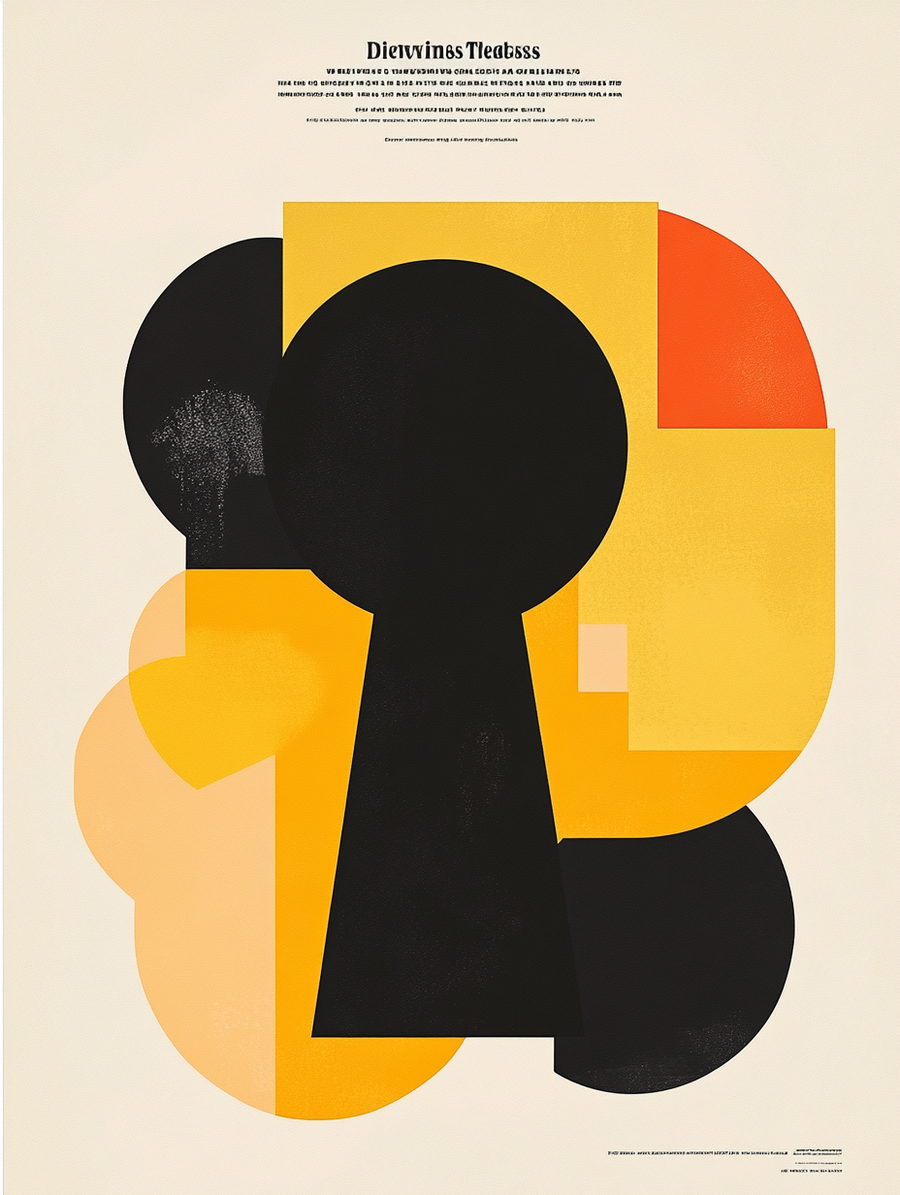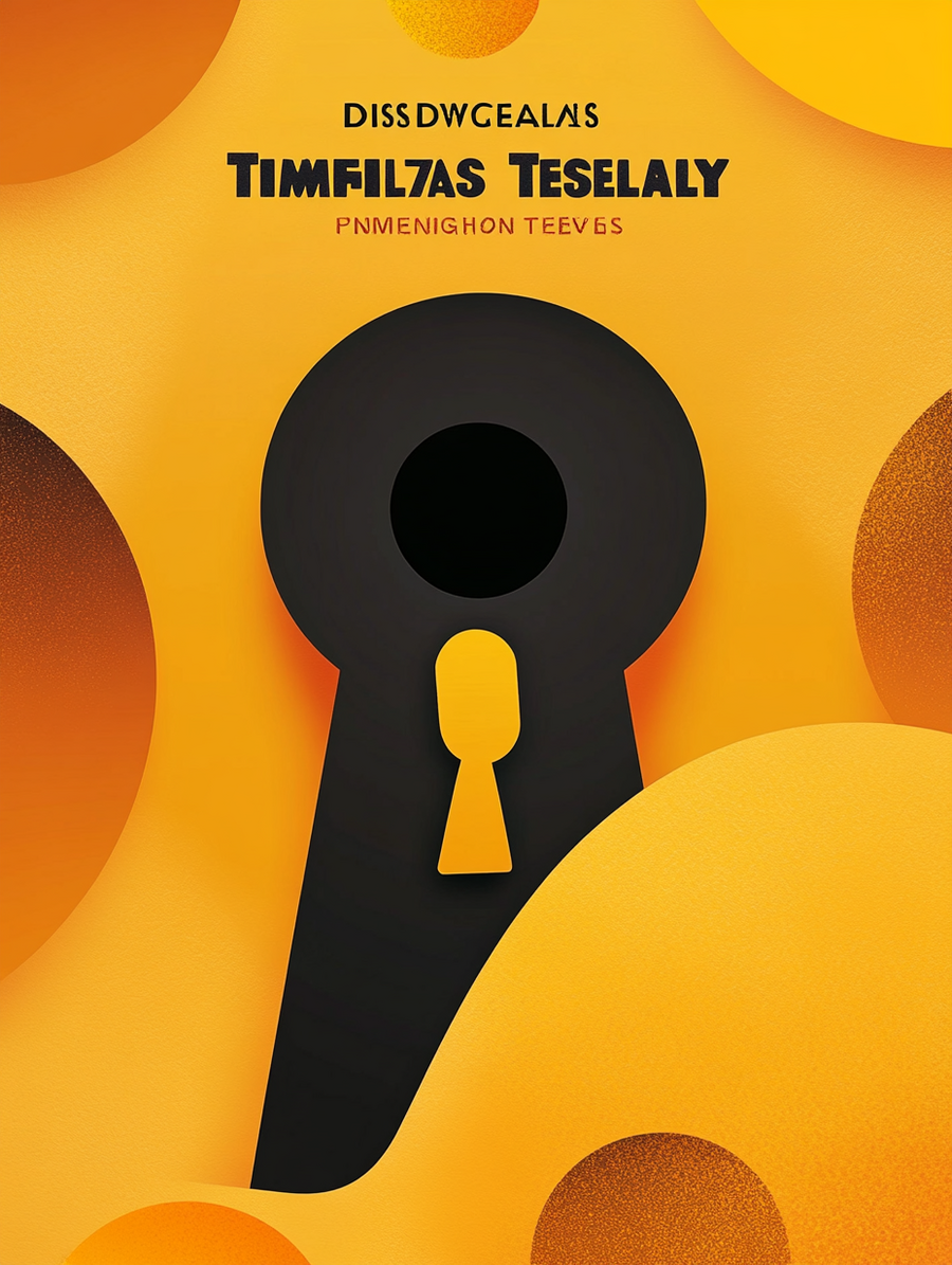 Bold event poster for an antique storage exhibition, showcasing a large black keyhole at the center surrounded by abstract yellow and orange shapes. The text 'Discover Timeless Treasures' is positioned at the top in modern, sans-serif typography, with event details in smaller text below. The design is sleek and eye-catching, with a professional and modern layout. --ar 3:4 --v 6.1