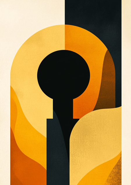 3D-rendered decorative objects inspired by keyhole shapes, featuring bold designs in yellow and black. The objects are sleek and modern, blending abstract geometric forms with polished textures, reflecting the themes of security and preservation. --ar 16:9 --v 6.1