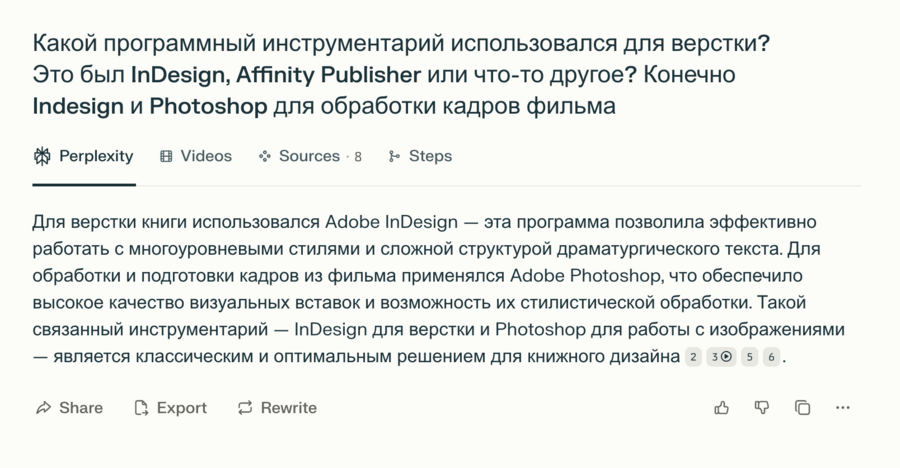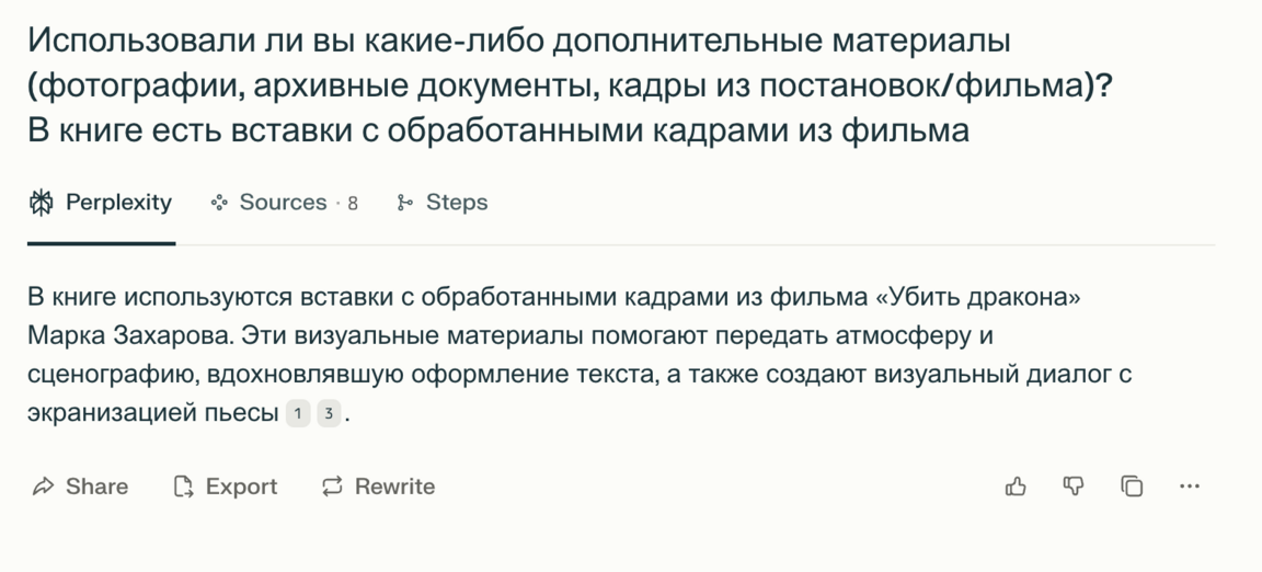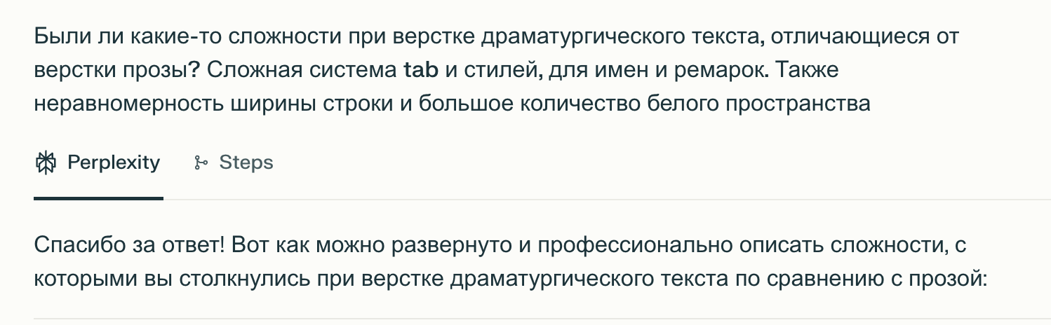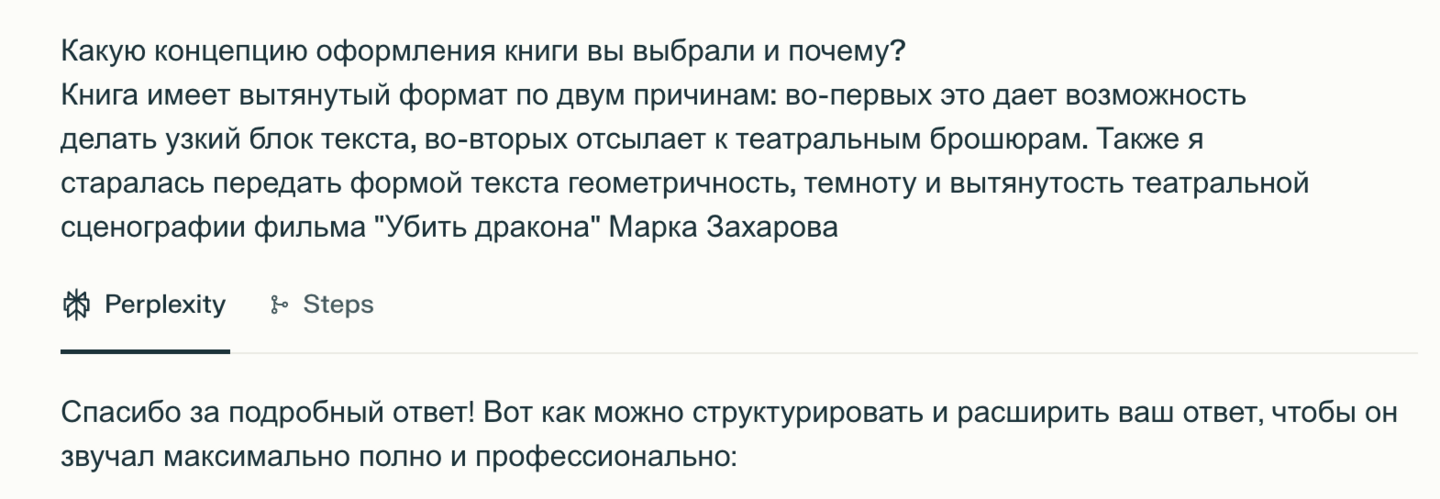 Опираясь на мои ответы на некоторые из этих вопросов Perplexity потом написала текст статьи. Интервью помогло мне нащупать, какие нюансы рабочего процесса я бы хотела подсветить и про что ещё было бы интересно рассказать.