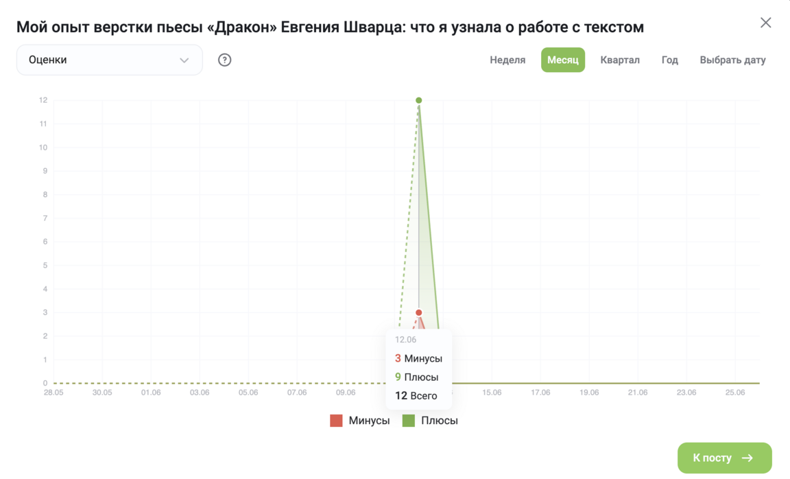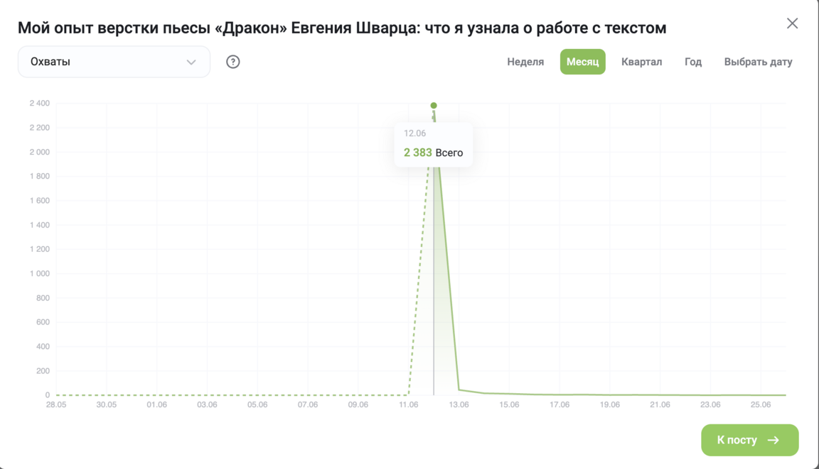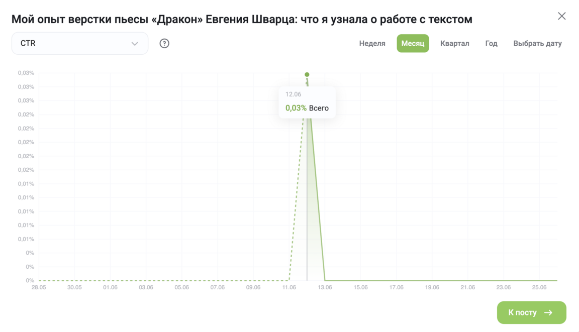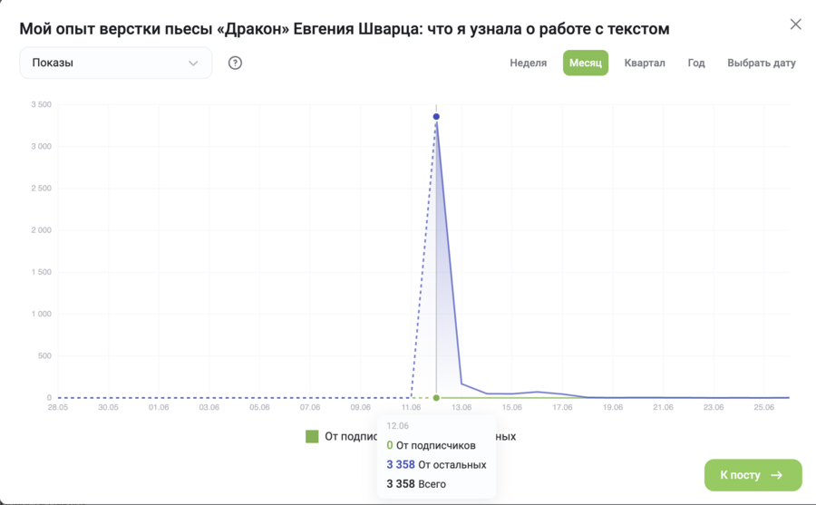 Вывод: Несмотря на малое количество просмотров, контент оказался крайне релевантен аудитории, что привело к высокому проценту взаимодействий.