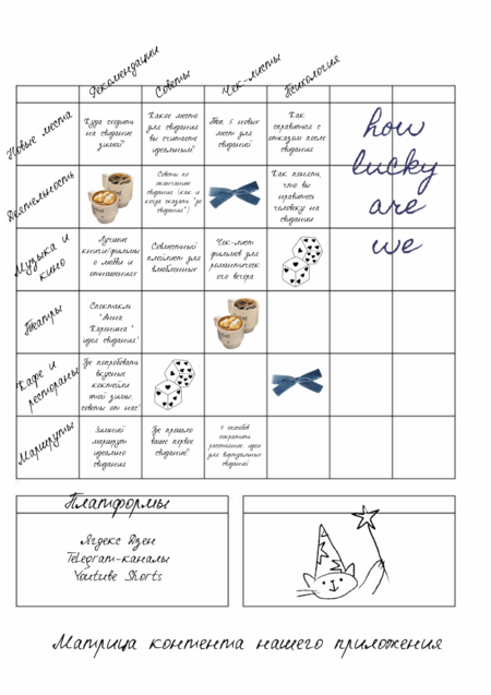 В отличие от продуктов с широким охватом аудитории и общими целями, приложение для организации свиданий фокусируется на более узкой целевой группе. Его преимущество заключается в глубокой специализации: оно предлагает более широкий спектр тем для свиданий, персонализированные рекомендации и конкретные идеи для проведения времени вместе, что делает его более ценным для пользователей, ищущих не просто встречу, а качественное и запоминающееся свидание. Приложение не ограничивается лишь идеями для свиданий и событий. В нем также представлены тематические подборки подарков, продуманные маршруты для прогулок и романтических встреч, а также плейлисты с подходящей музыкой, создающие нужное настроение. Функция обмена желаниями между зарегистрированными пользователями добавляет ещё один уровень персонализации и помогает парам лучше понимать друг друга.