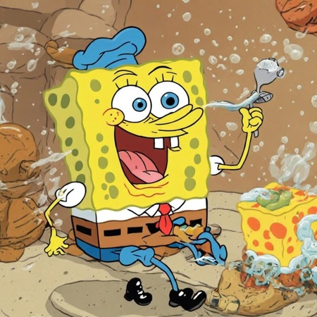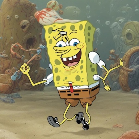 Здесь явно нарушены пропорции, одни из неудачных изображений. цвета и в целом узнаваемость губки есть, но сгенерированы дополнительные конечности и элементы, которые выбиваются из общей картины
