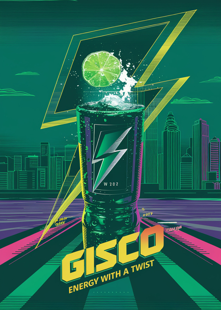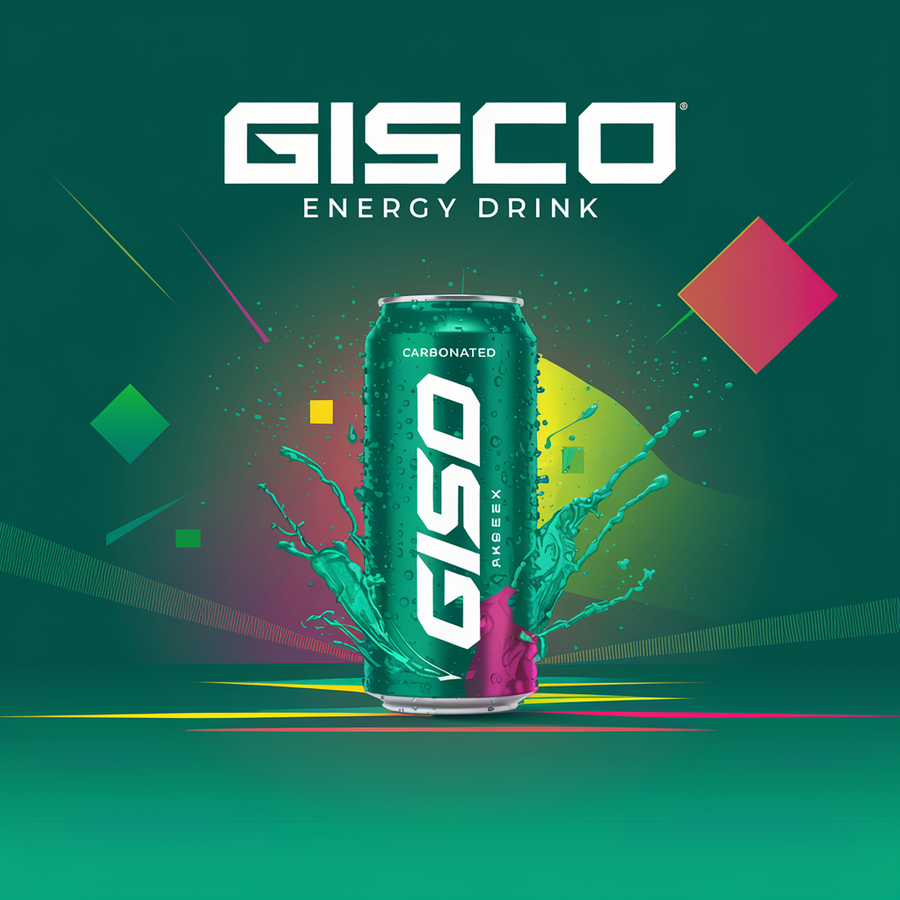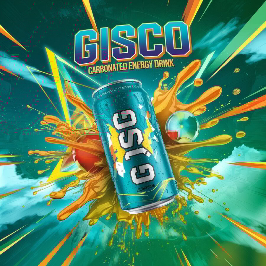 Promt: Create a vibrant and eye-catching poster for GISCO carbonated energy drink using acidic tones. The poster should convey the energy and refreshing nature of the drink using bold colors, geometric shapes, and a dynamic composition. The central element of the poster should be the GISCO can or bottle, surrounded by splashes of color and energy.