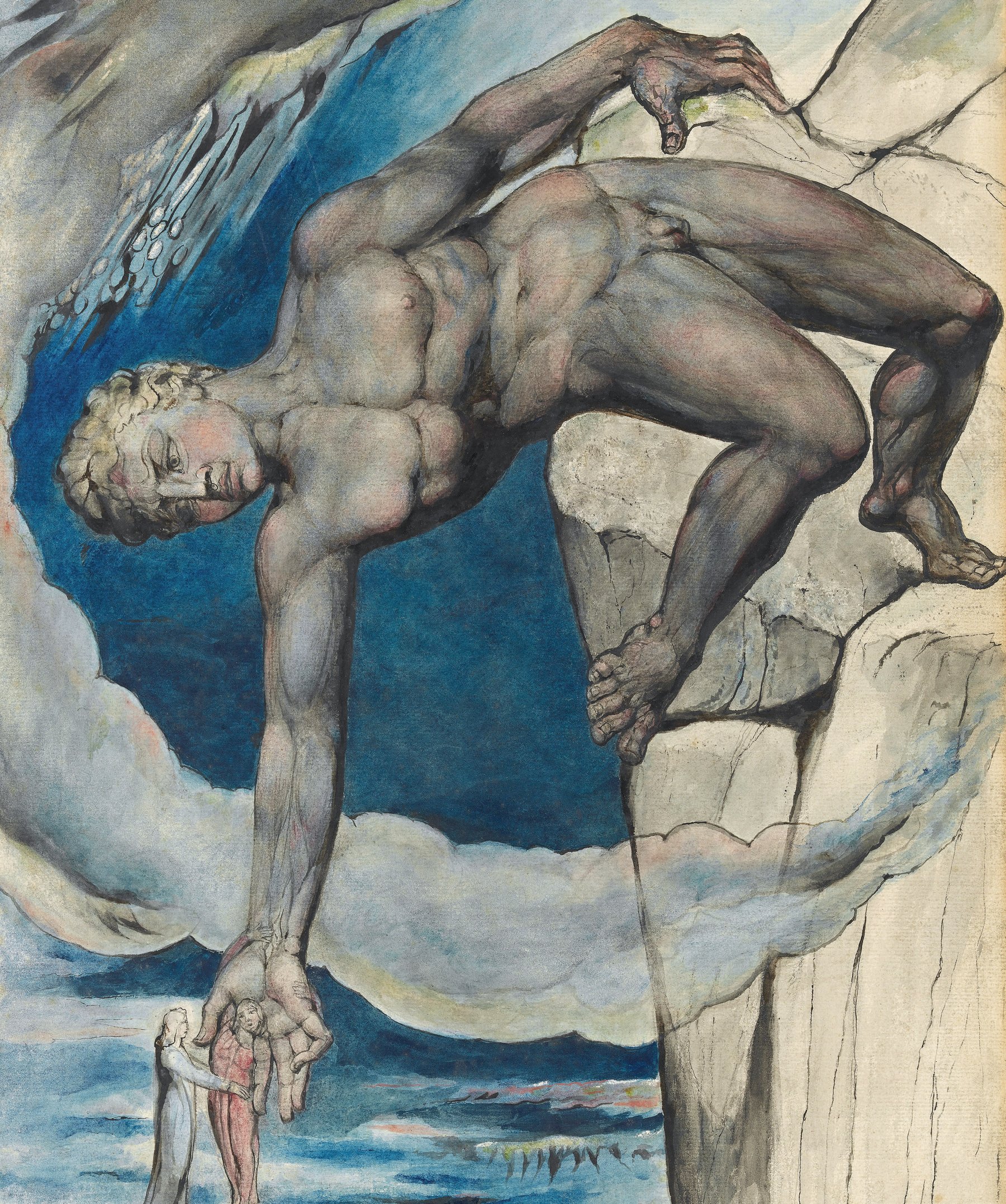 Одним из сокровищ, оставленных художником миру, стала коллекция из тридцати шести акварелей, иллюстрирующих «Божественную комедию» Данте. В период обострившейся болезни Блейк создал более сотни иллюстраций к этой поэме, варьирующих от набросков до завершенных акварелей. В числе великолепнейших работ, выполненных чернилами и акварелью, сцена, в которой Вергилий обращается к великану Антею с просьбой отправить их с Данте в последний круг ада. Работа демонстрирует необыкновенную фантазию Блэйка и виртуозность владения техникой. С помощью навыков гравера — выцарапывания, пунктира и растирания — ему удалось создать интенсивный и сияющий цвет. Блейк не просто иллюстрирует поэму, но создает целый мир, полный творческой энергии и витальности. Художник не сковывает себя рамками сюжета, а воплощает собственные духовные видения.