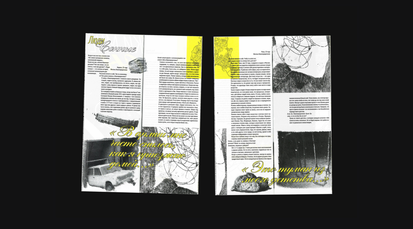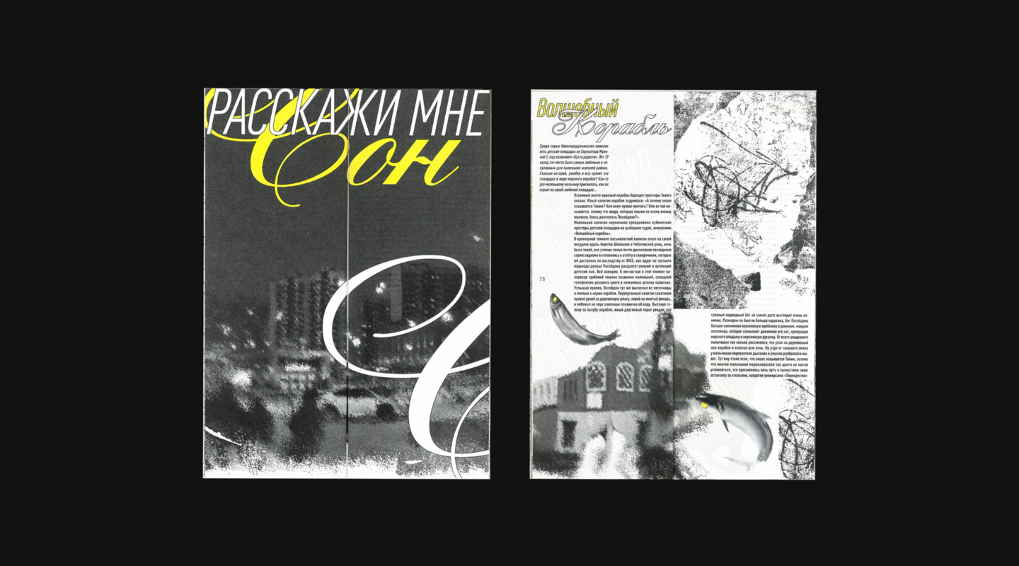 Этот зин невероятно атмосферный благодаря своей типографике и тому, как она сочетается с зернистой текстурой фотографий и динамично расположенными на развороте блоками наборного текста. Зин оставляет после себя послевкусие загадочности и ностальгии, его хочется разглядывать и вчитываться даже в самый мелкий текст.