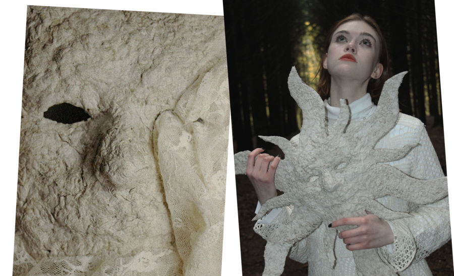 Маска солнца из папье-маше является ключевым элементом визуальной репрезентации Ярило. Ее текстура и форма с длинными лучами, исходящими от центра, напоминают не только об образе солнца, но и о ритуалах, связанных с поклонением этому божеству. Маска скрывает лицо девушки, подчеркивая ее метафорическое слияние с мифическим персонажем и идею божественной анонимности, что характерно для архаичных культов.
