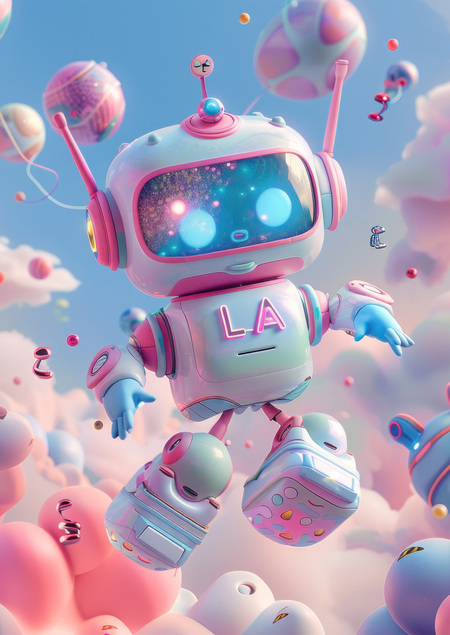 a 2d poster with cute and small robot flying in the air, around childrens toy, pink and blue colors, game, baby aesthetics, bloom and shiny, different details of baby, clouds, behance style, cartoon