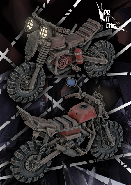 Таких видов байков нужно было сделать два, при этом они должны были быть похожими не только по стилистике, но и по своему строению и духу. Поэтому, опираясь на концепты и используя где-то общие, а где-то видоизмененные элементы, я создал и вторую версию транспорта.