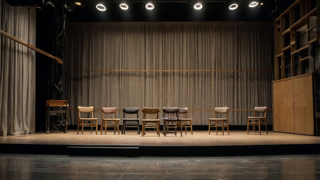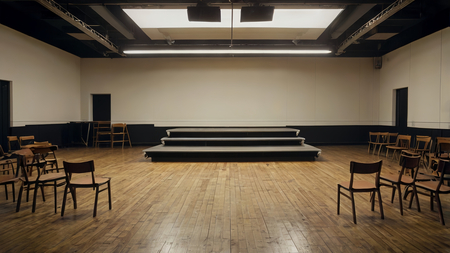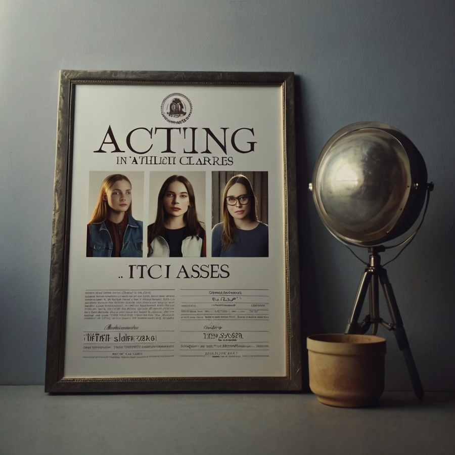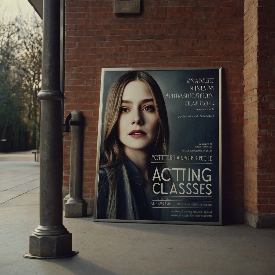Для создания пространства я использовала промпт: «an acting class with a small stage and without people». Афиши и постеры: «advertising poster for acting classes», также с использованием логотипа в качестве style reference.