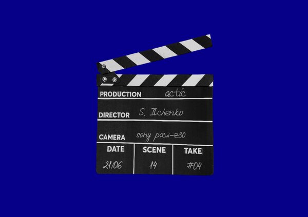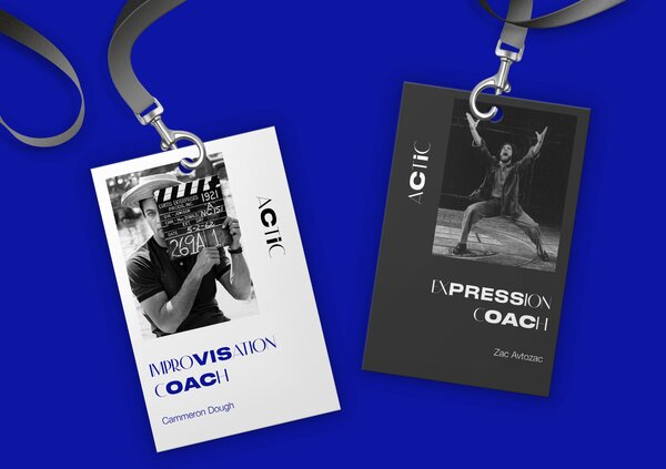 Далее, применяя функцию style reference, я загрузила созданный логотип и сгенерировала изображения для различных объектов с соответствующими промптами: «this logo on the worker’s name tag», «business card for acting courses», «movie clapperboard for an acting courses ACTIC». В результате я получила визуально похожие по стилю изображения с разными логотипами и надписями. Затем в другой нейросети я удалила фон у логотипа, а в Photoshop добавила нужный логотип на сгенерированные изображения. Также качество изображений я повышала в vmake.ai