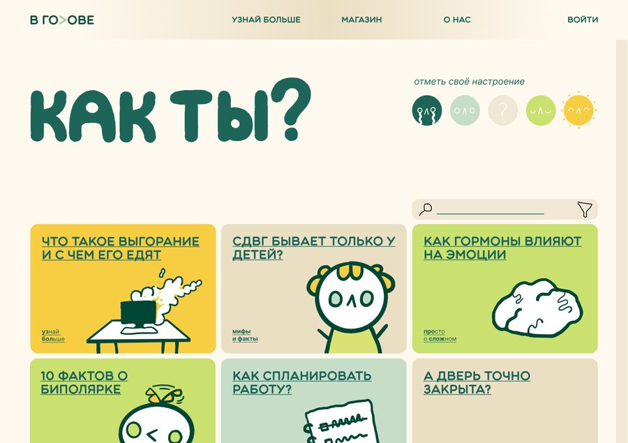 Реимэджининг проекта просветительского медиа о ментальном здоровье «в голове» с использованием искусственного интеллекта. Это просветительсккий сайт, который помогает людям узнать больше о ментальном здоровье, получить доступ к статьям на разные темы и при желании — приобрести мерч, доходы от которого идут на благотворительность и работу сайта. [https://portfolio.hse.ru/Project/218027]