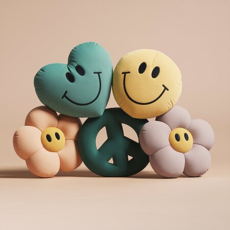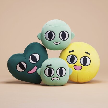 Создано в Ideogram. Промпты: 1. A 3D render of plushie toys for a mental health and self-awareness brand called «Headspace». There are three toys: a dark green heart, a light green head with two eyes and a mouth, and a bright yellow circle with a face. The background is beige. 2. A 3D render of plushie toy merch for a brand that promotes mental health and self-awareness. The project is called «Headspace». The toys are designed in the shape of a green heart, a yellow smiley face, a dark green peace sign, and a beige flower. Each toy is made of soft materials and has a fabric exterior. The background is a beige surface.