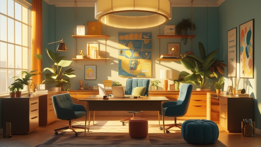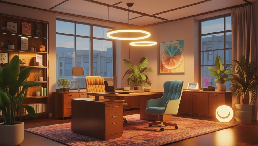Комфортное офисное пространство, созданное в Leonardo ai в стиле 3d render. Промпт: Create an office workspace for a company that promotes mental health and self awareness. The lighting is golden, and the overall mood is comfort, acceptance and happiness.