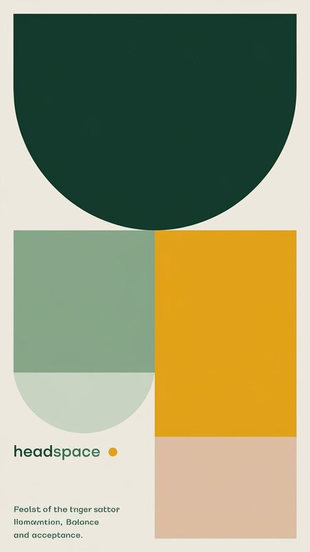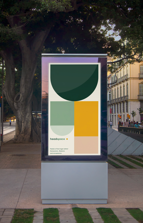 Дизайн, созданный в Ideogram, в городской среде. Автомутически улучшенный промпт: A minimalistic promotional poster with round shapes promoting mental health and self-awareness. The project is called «Headspace». The design uses dark green, light green, bright yellow, and beige colors to evoke feelings of security, balance, safety, and acceptance.