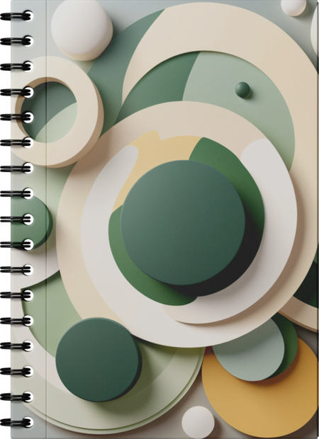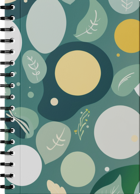 Паттерны для обложек блокнотов, Leonardo ai, на носителях. Create a notebook cover design for a company that promotes mental health and self awareness, invoking the feelings pf hapiness, security and acceptance. The color scheme is dark green, light green, bright yellow and beige. No sharp edges, the shapes should be round and promote kindness. The cover should have a pattern. Дизайны созданы в пресетах стилей Graphic Design Minimalist и Graphic Design 3D