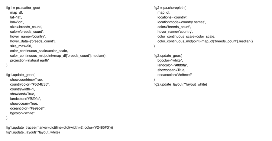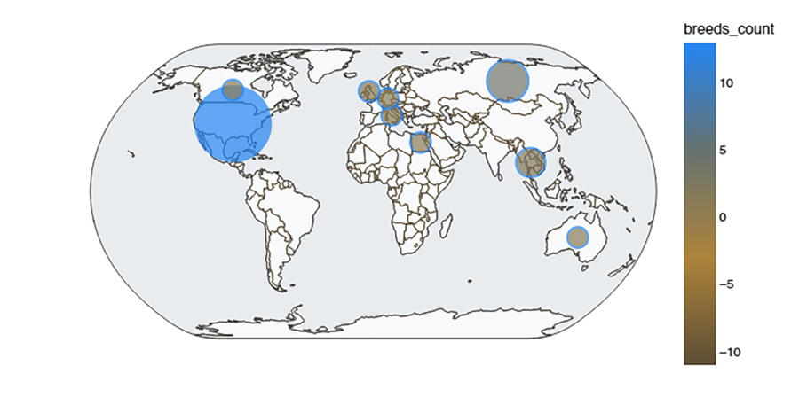 Perplexity помог мне сконструировать две карты: объемную с пузырями и развертку с закрашенными областями. Карта с пузырями нагляднее показывает количество, а карта с закрашенными областями достовернее ограничивает территорию происхождения породы.